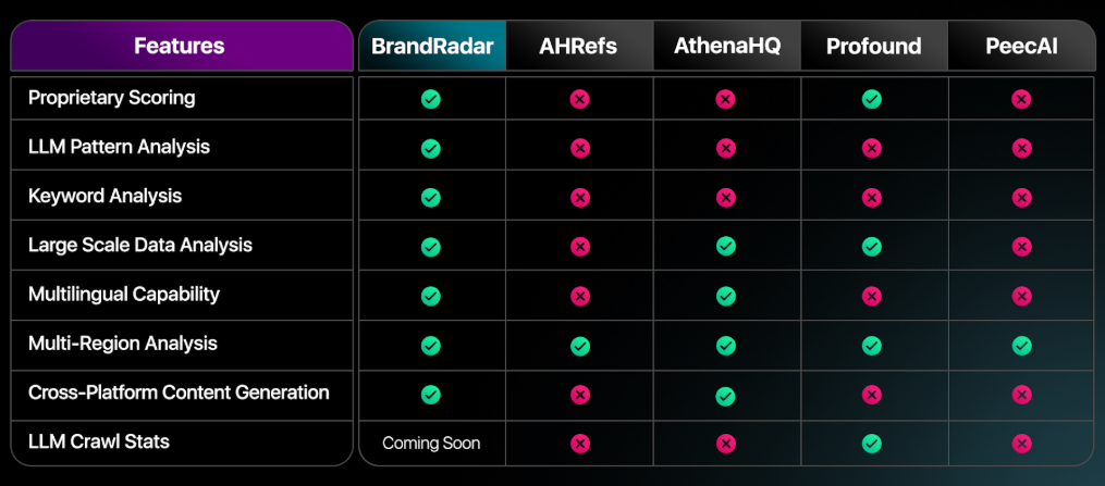 That’s where BrandRadar stands out. Unlike other GEO platforms, it’s designed not just to monitor AI answers, but to operationalize them. Here’s a side-by-side comparison of how BrandRadar stacks up against Athena HQ, Profound, Scrunch AI, and Ahrefs: